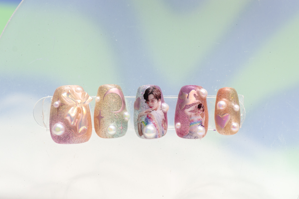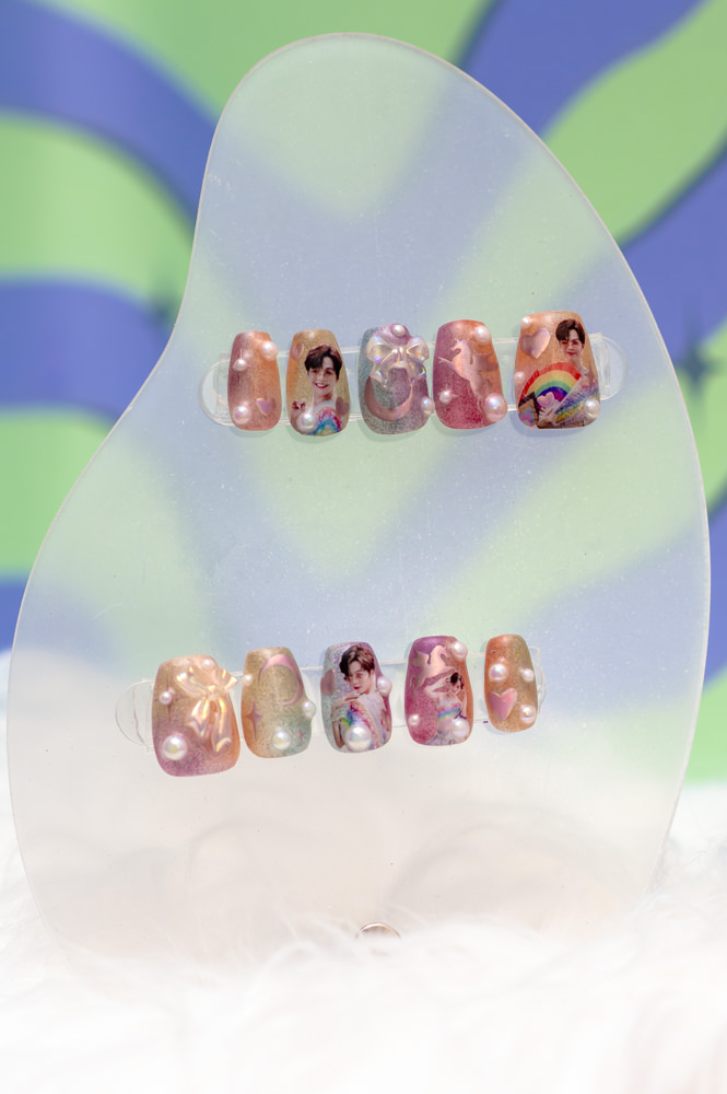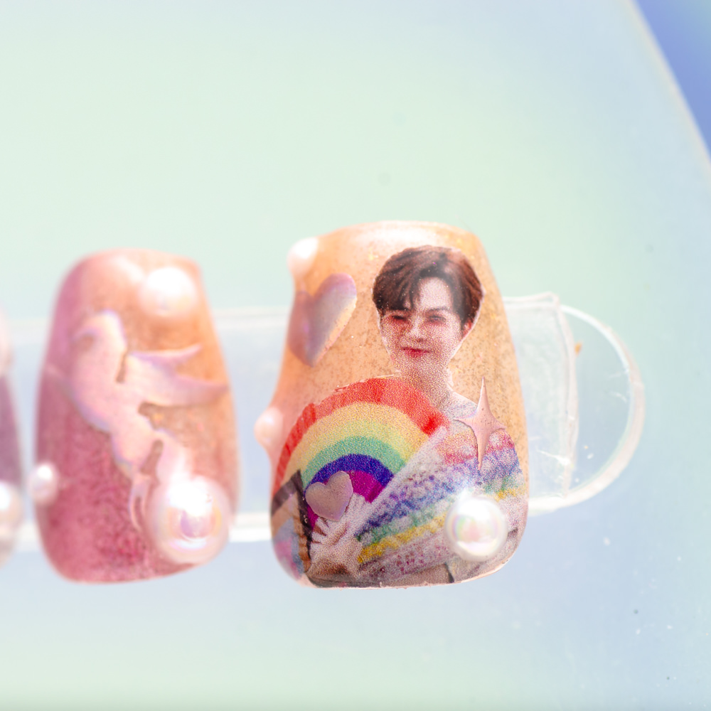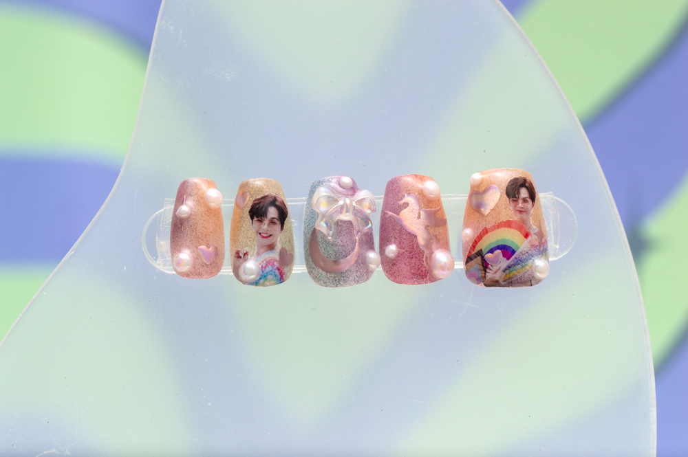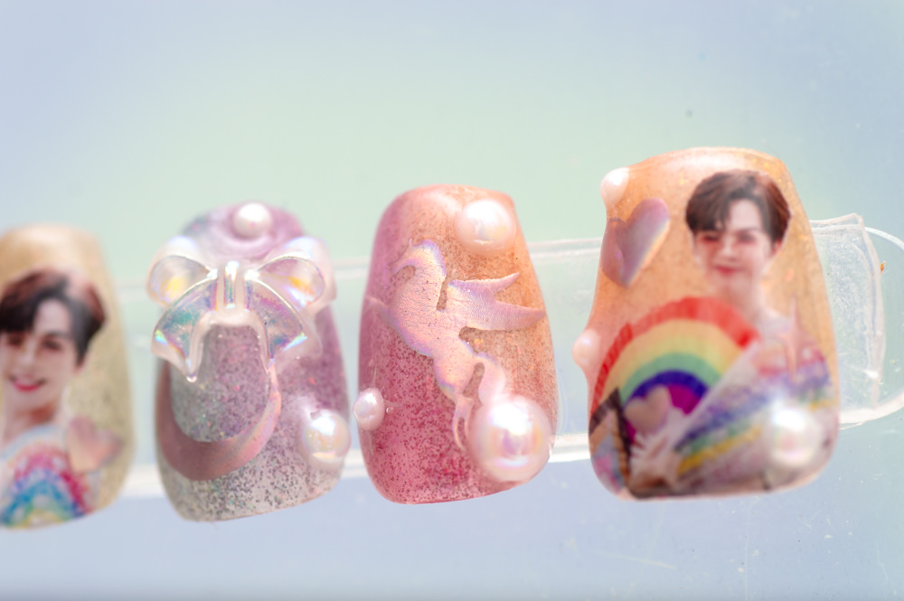 One of my friends absolutely adores Earth Katsamonnat, known sometimes as Cooheart, a Thai actor who primarily acts in queer media. He had an incredible Pride parade fit last year, so I took some of those images, made decals, and set about making a set of nails for her! And you can make the same set too! They’re fairly simple and look absolutely exquisite for the amount of work they take.